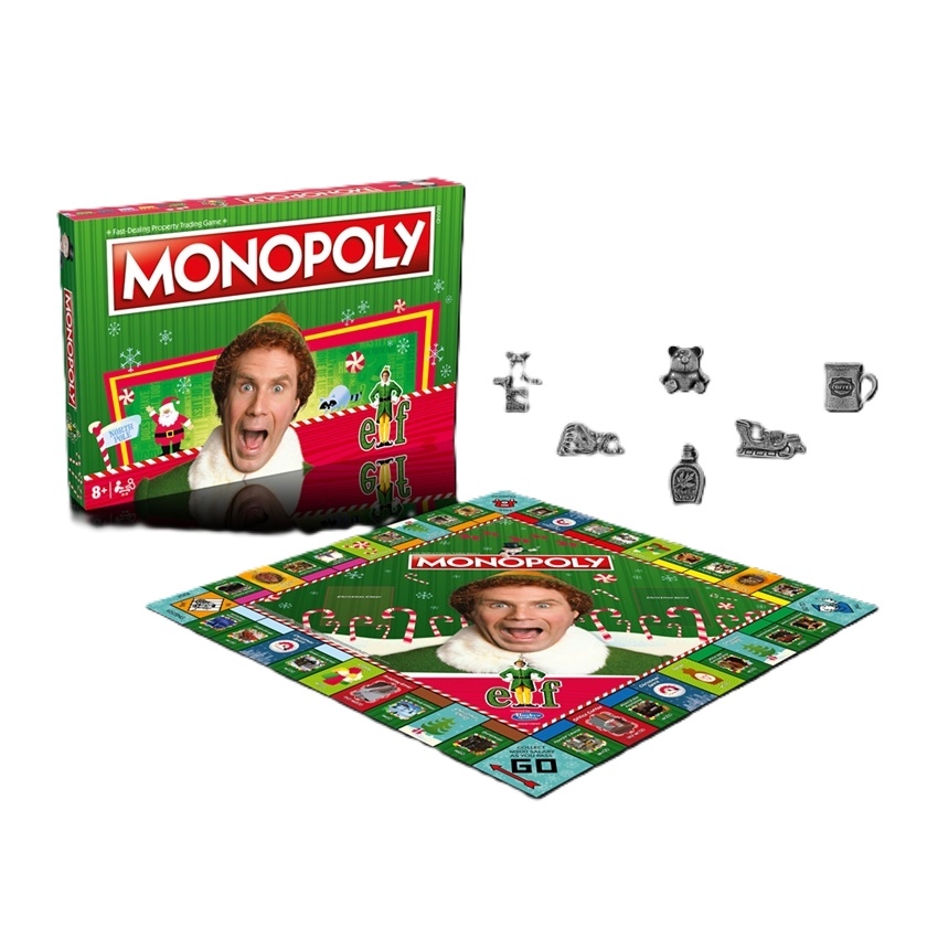 Monopoly Elf, Engelstalig bordspel van uitgever Hasbro. Ga met Buddy de Elf™ mee naar het magische New York en beleef zijn avonturen opnieuw terwijl hij nieuwe plekken verkent, zijn vader vindt en Kerstmis redt met de Kerstman. Deze speciale editie van Monopoly, een ode aan de klassieke kerstkomedie, laat je wonderlijke bezienswaardigheden verzamelen en ruilen langs de route van Buddy, zoals de Werkplaats van de Kerstman, Speelgoedwinkel Gimbels en de Lincoln Tunnel. Bouw appartementencomplexen en wolkenkrabbers om je tegenstanders hogere huren te laten betalen. Probeer alle vier de belangrijkste voedselgroepen te verzamelen om nog meer kerstsfeer te verspreiden, maar pas op voor de straffen voor kantoorkoffie en drukfouten bij Hobbs & Son Publishing!